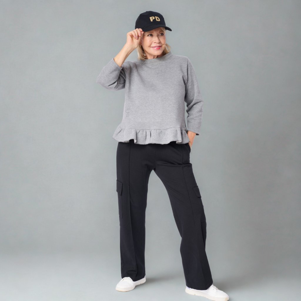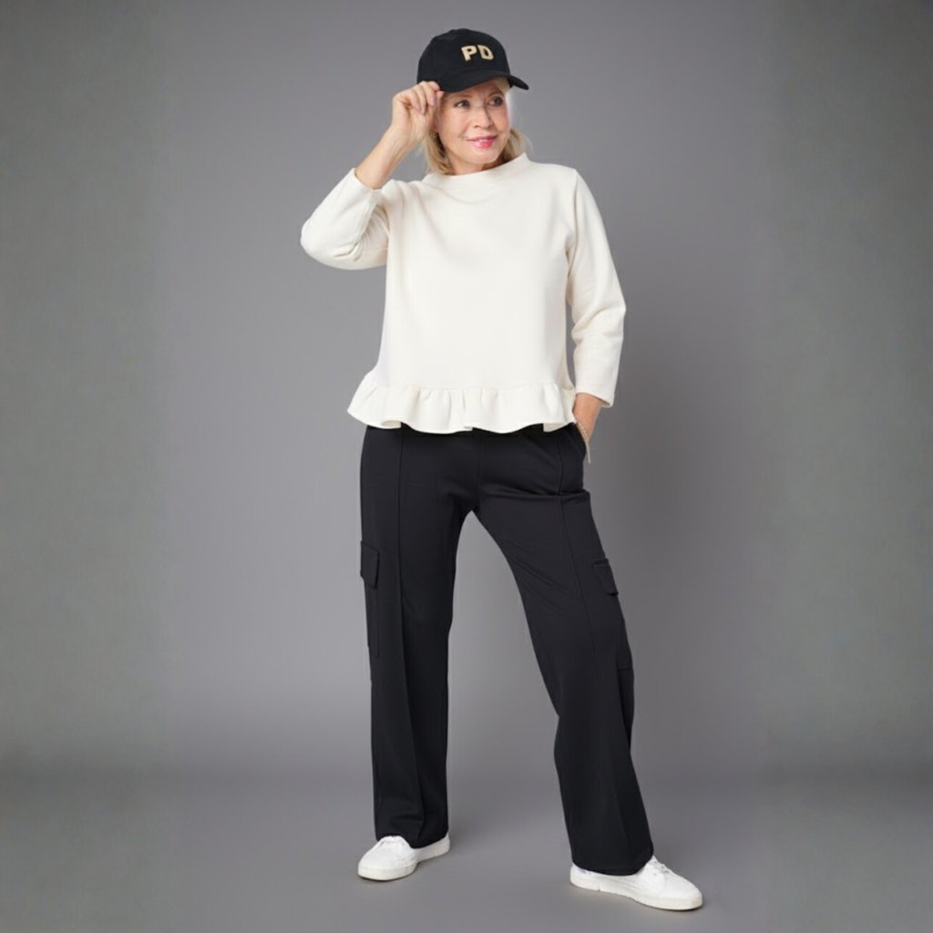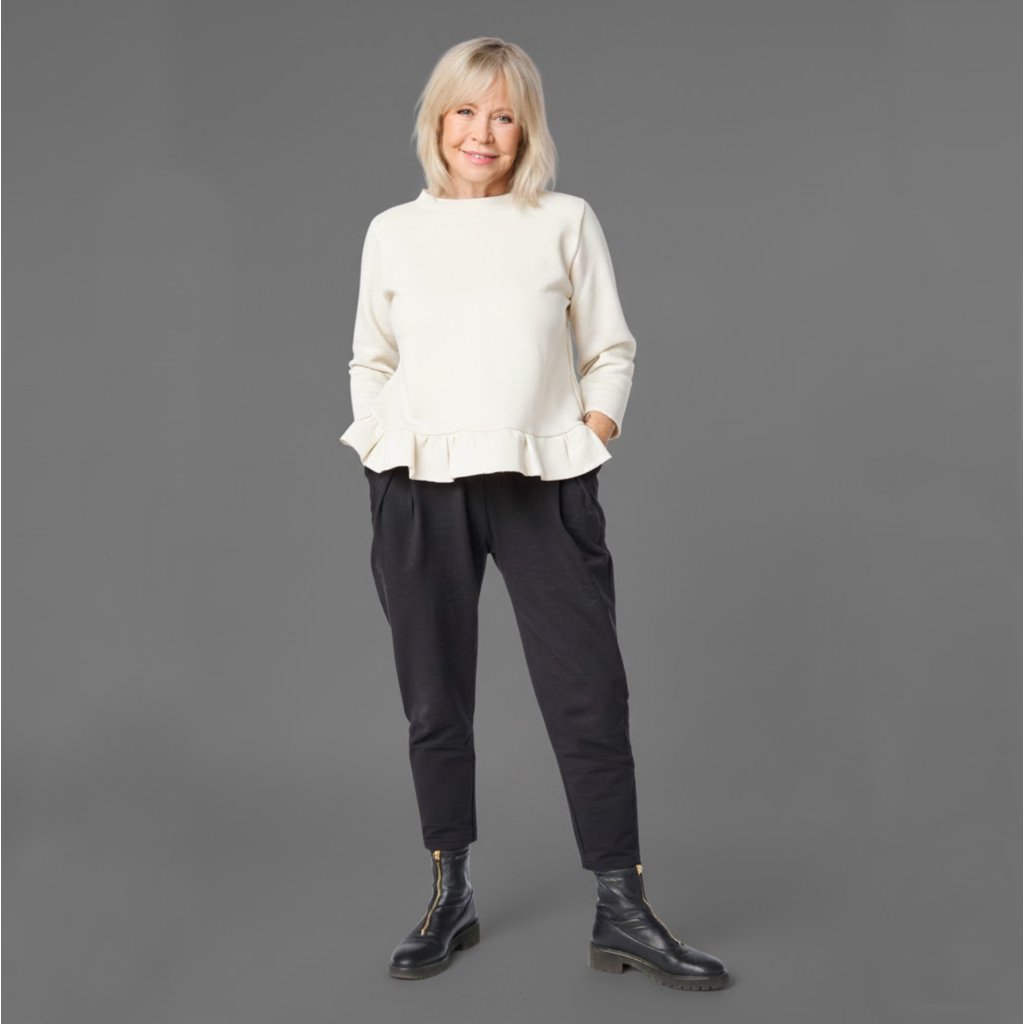 Tato smetanová mikina zaujme sofistikovaným designem, ve kterém se snoubí elegance s lehkou hravostí. Je vyrobena z příjemné směsi bavlny a elastanu, která zajišťuje maximální komfort, hebkost na dotek a zároveň perfektní tvarovou stálost. Jemný volánek na spodním lemu dodává modelu ženský půvab a originální charakter, zatímco boční zip na levé straně funguje jako stylový akcent podtrhující moderní siluetu. Mikina je dostupná také v delší variantě sahající přes boky, která nabízí ještě větší pohodlí a elegantní prodlouženou linii. Výsledkem je nadčasový kousek s precizními detaily, ideální pro elegantní i uvolněné stylingy. Skvěle se kombinuje s kalhotami Patte Fern a Street pro vytříbený městský look.