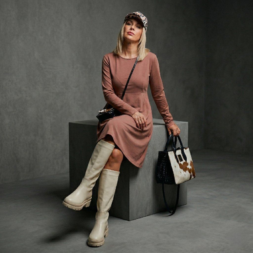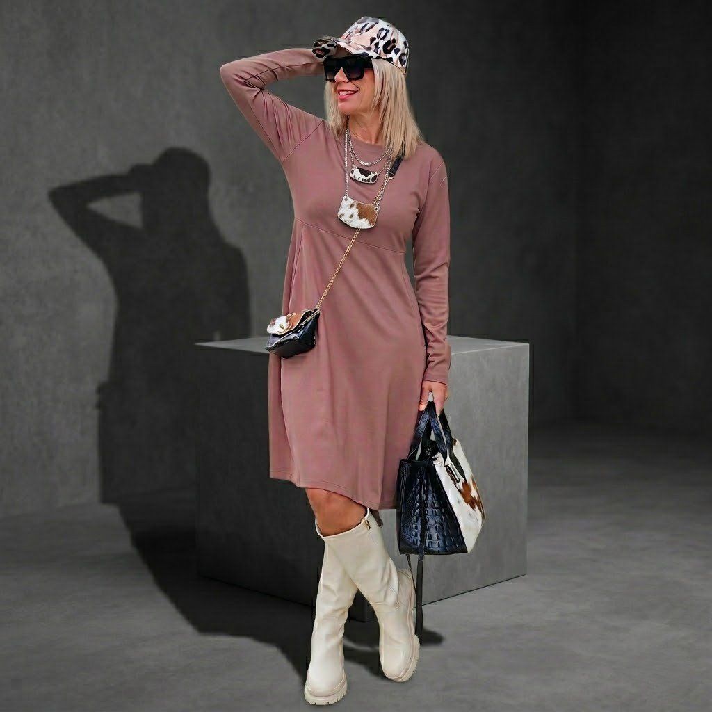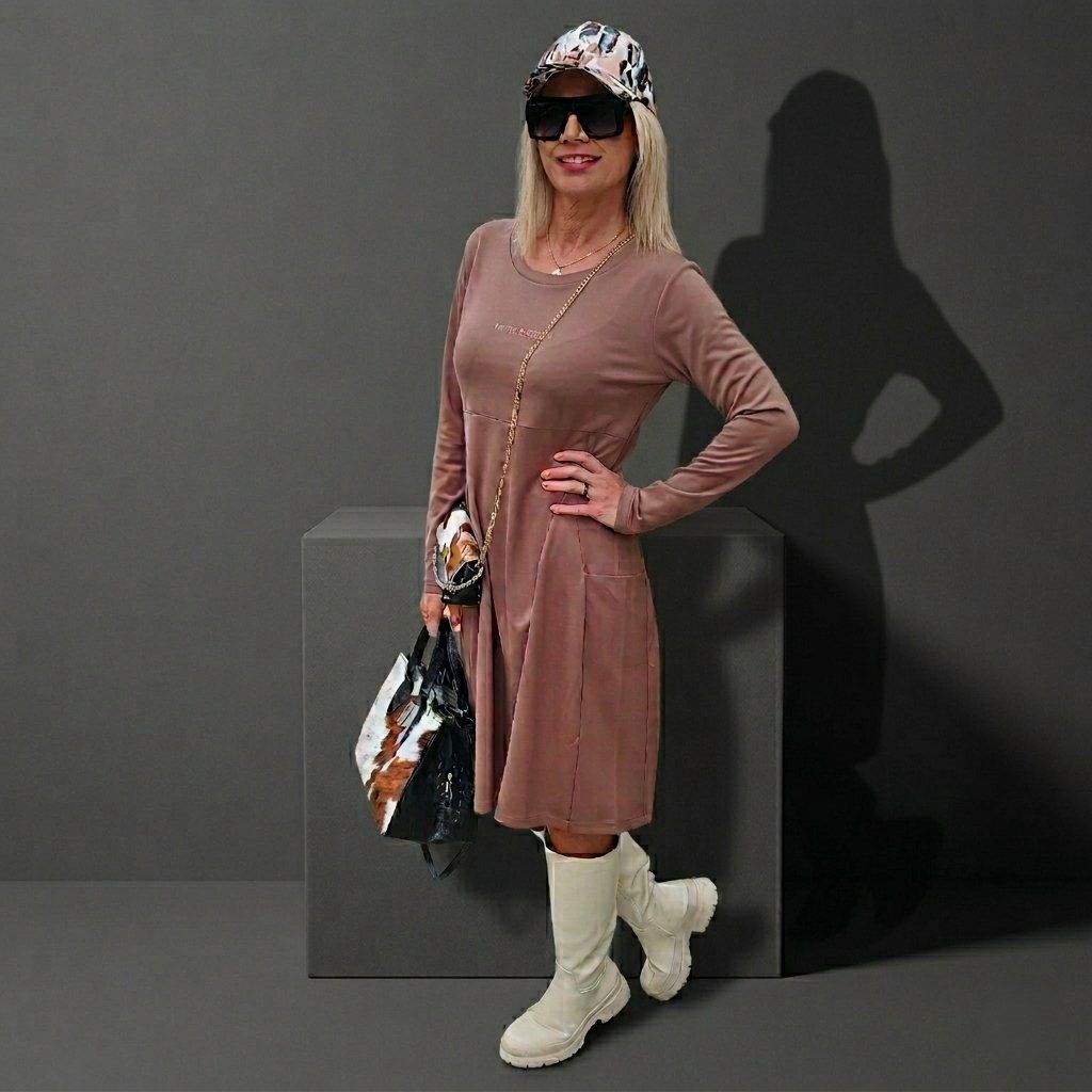 Elegantní šaty s důrazem na ženskost a pohodlí. S jemným výstřihem, dlouhými rukávy a pasem zvýrazněným pod prsy přirozeně podtrhují siluetu a vytvářejí sofistikovaný, ale uvolněný vzhled. Lehce rozšířená sukně dodává šatům vzdušnost i noblesní pohyb, který lichotí každé postavě. Délka pod kolena zvýrazňuje ladnost nohou a vkusné kapsy v bočních švech přinášejí praktický detail bez kompromisů na stylu. Ideální volba pro podzimní dny, kdy chcete působit žensky, sebevědomě a s lehkostí.