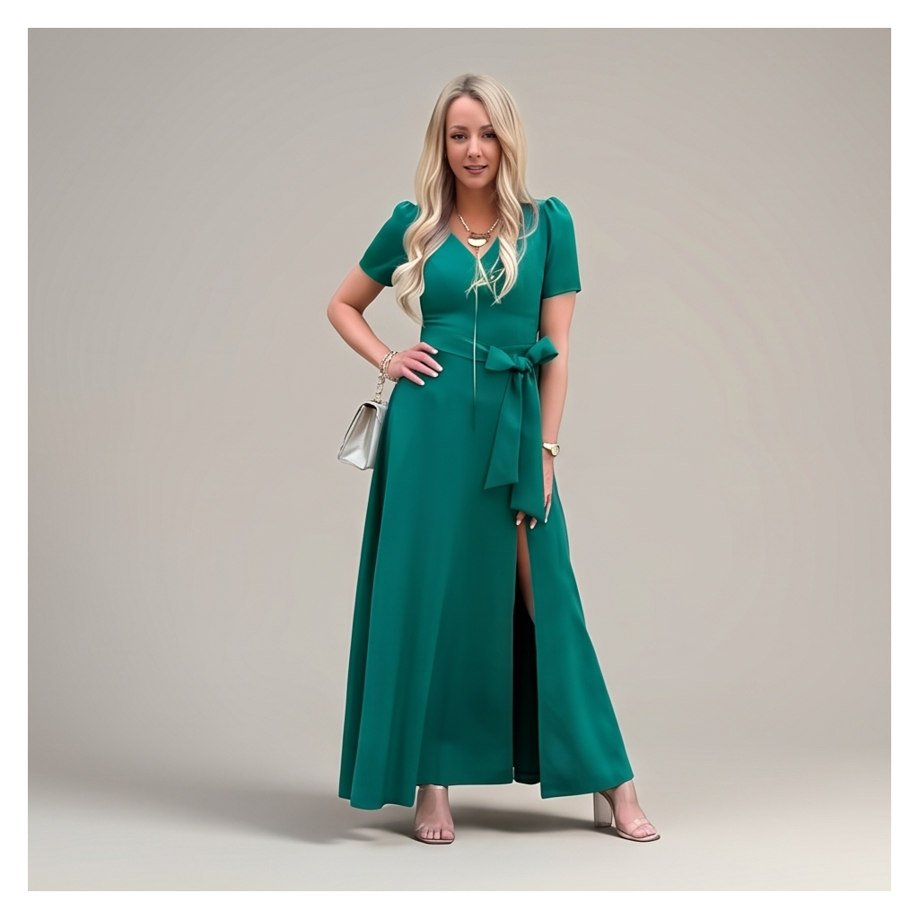 Silueta: Dlouhý áčkový střih sukně s rafinovaným rozparkem. Šaty s hlubokým výstřihem