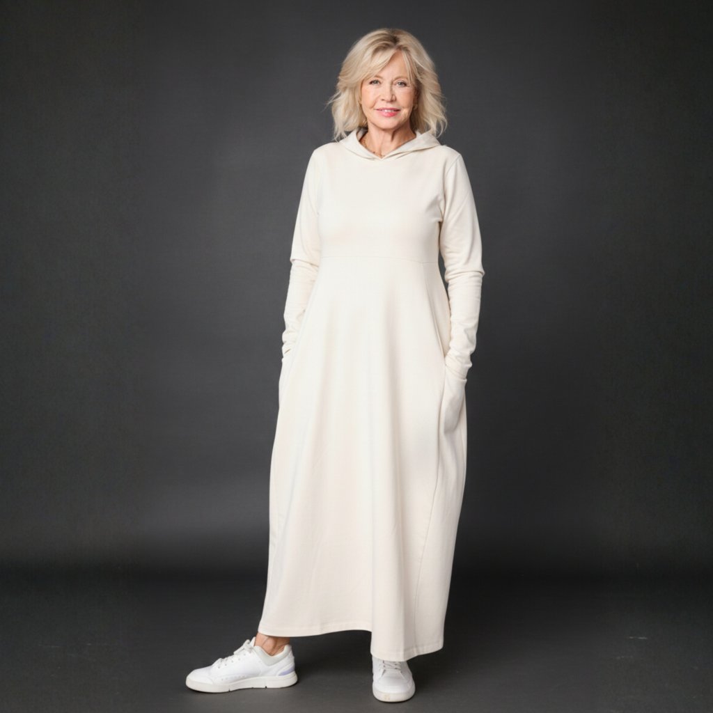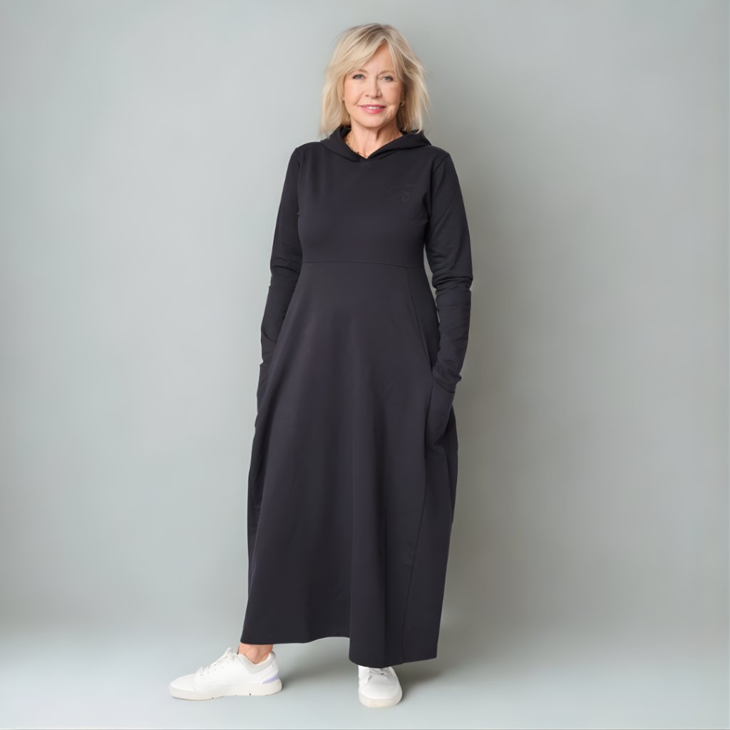 Tyto dlouhé černé šaty s kapucí a dlouhým rukávem spojují pohodlí každodenního nošení s kultivovanou elegancí. Střih je jemně prostřižený pod prsy, čímž přirozeně zvýrazňuje siluetu a zároveň poskytuje dostatek volnosti a komfortu.