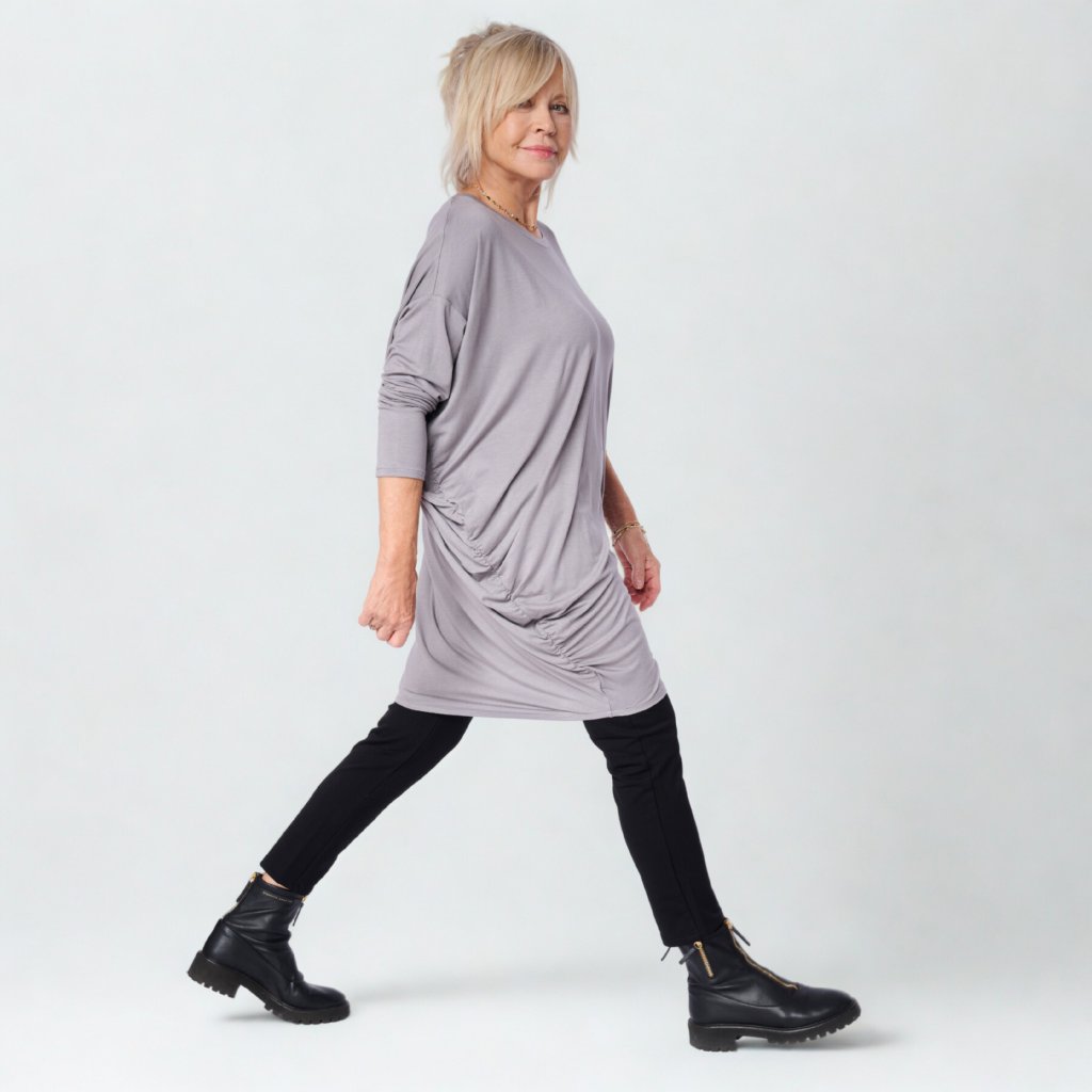 Silueta bez kompromisů: Velkorysý volný střih v kombinaci s asymetrickými prvky nenuceně maskuje drobné nedokonalosti a oslavuje ženskou postavu v její nejpřirozenější kráse.