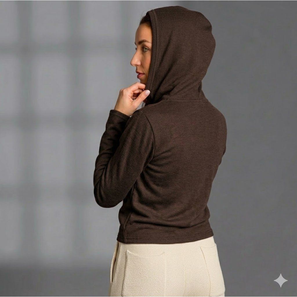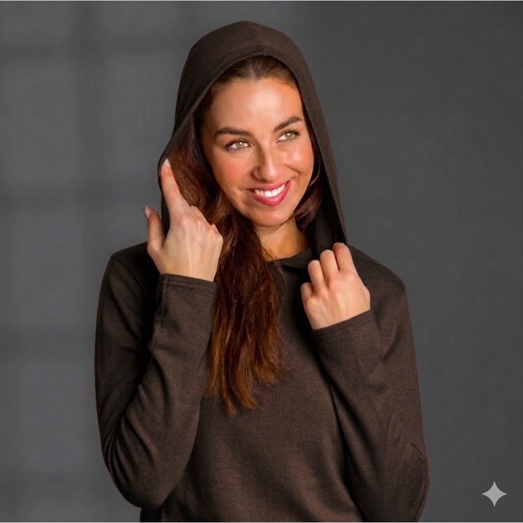 Luxusní tričko s dlouhým rukávem a kapucí Rib, hnědé
