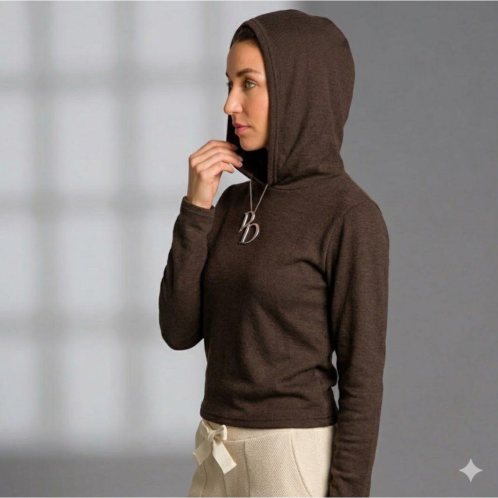 Představujeme vám dámské tričko s kapucí v atraktivní hnědé barvě z dílny renomované české návrhářky, navržené pro ženu, která chce být v každém okamžiku nepřehlédnutelná. Tento model v sobě snoubí precizní řemeslné zpracování s originálním designem, který vdechne vašemu šatníku nový život. Díky svému promyšlenému střihu s kapucí se perfektně hodí ke všem našim kalhotám, nebo v kombinaci se sakem, čímž vytváří základ pro nespočet stylových variací.