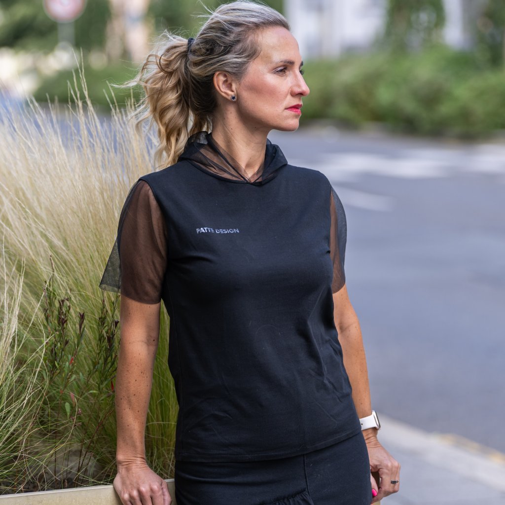 Tento outfit zaujme svým jedinečným spojením ležérní elegance a moderního designu. Luxusní bomber s plastickým logem PATTE DESIGN na zádech dodává výrazný a sebevědomý charakter, zatímco široké kalhoty nad kotníky se sámky v pase zaručují maximální pohodlí a lichotivý střih. Tričko s tylovou kapucí přidává outfitu ženskost a módní originalitu. Tričko můžete vyměnit za bílou košili.